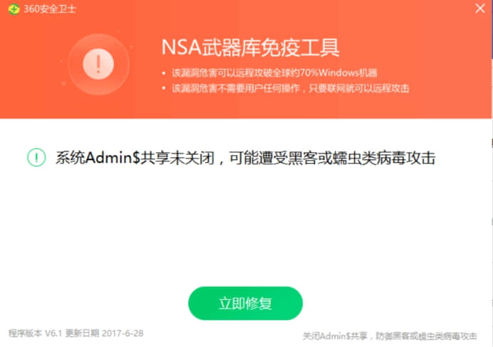 4. 安裝好NSA免疫工具后,它會讓您立刻修復.點擊立刻修復.