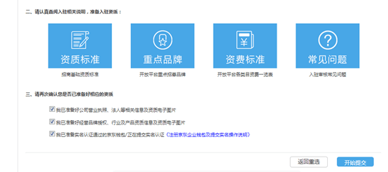 5、查看京東平臺(tái)入駐相關(guān)資質(zhì)要求,確認(rèn)后點(diǎn)擊開(kāi)始提交