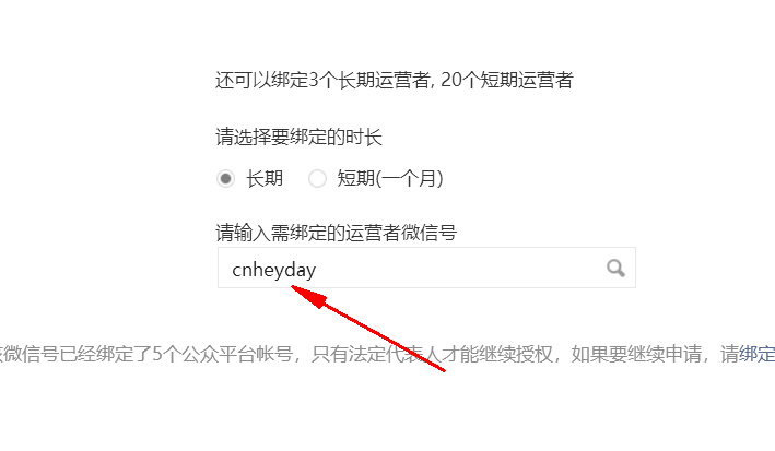 6.綁定的時(shí)長(zhǎng),選擇長(zhǎng)期. 輸入需要綁定的運(yùn)營(yíng)者微信號(hào)(有2個(gè)號(hào)需要綁定): cnheyday(盛世傳媒陳經(jīng)理號(hào)) sscmwlyyh(盛世傳媒運(yùn)營(yíng)號(hào))